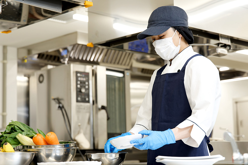 納品された食品の個数や消費期限、温度を確認します。昼食の調理と主菜の盛り付けをします。パートさんへの副菜の盛りつけの指示もします。