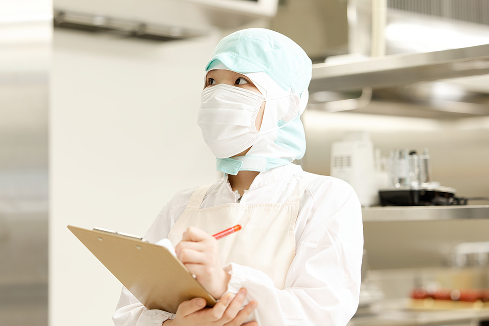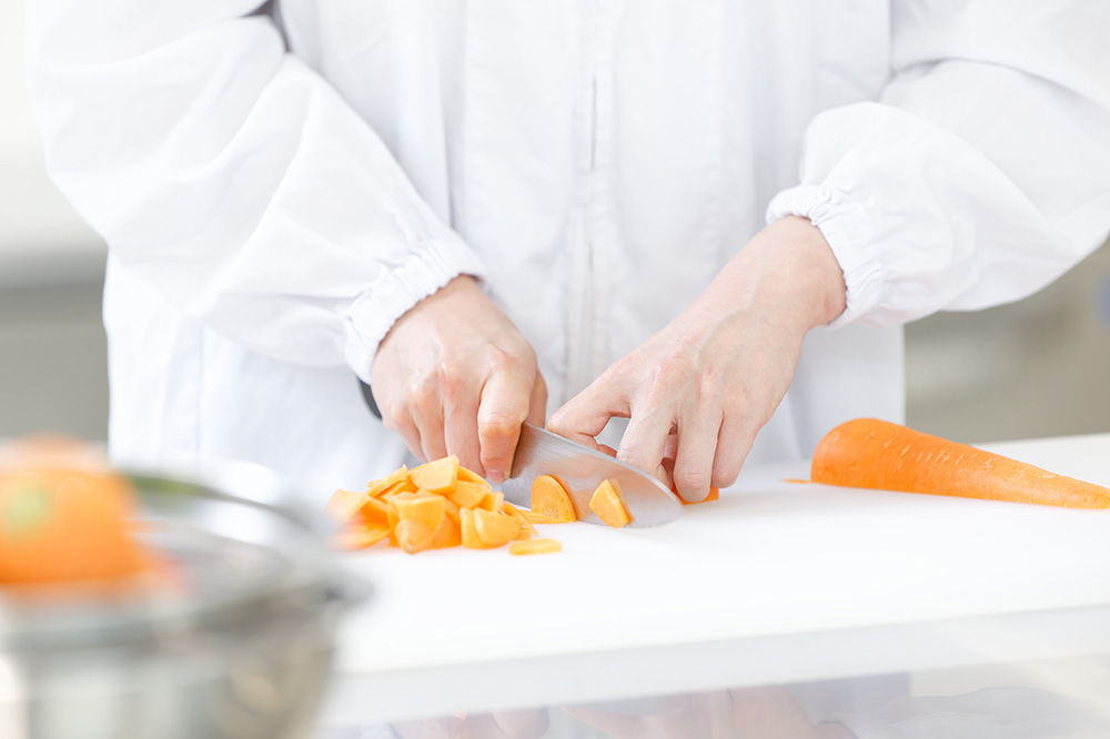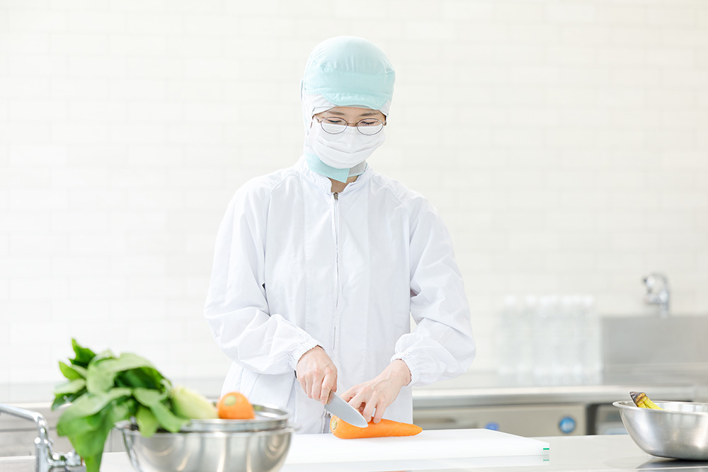 下処理を行った野菜をいためたり、肉や魚の汚染物を検品し調理します。